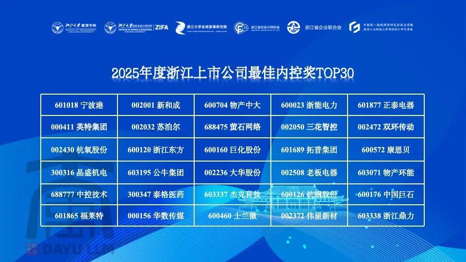 11月20日,第九屆企業(yè)高質(zhì)量發(fā)展與管理創(chuàng)新論壇在浙江大學(xué)舉辦,并揭曉2025年度浙江上市公司最佳內(nèi)控獎(jiǎng)TOP30,新和成再次上榜,連續(xù)9年獲此殊榮。